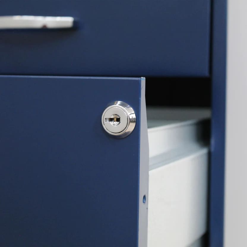 Construido en metal robusto con acabado azul, este archivero con llave aporta elegancia y durabilidad a los muebles de oficina.